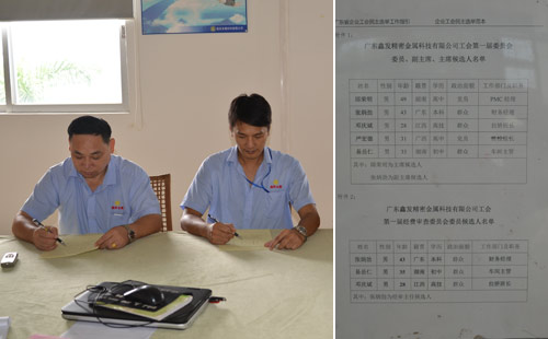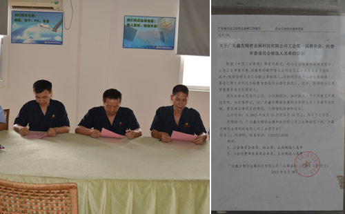 9月10日鑫發金屬公示了工會第一屆委員會、經費審查委員會的候選人的名單。9月14號召開廣東鑫發精密金屬科技有限公司工會第一屆第一次會員代表大會,會議選舉產生第一屆工會委員會和經費審查委員會的主席、副主席、委員和主任。